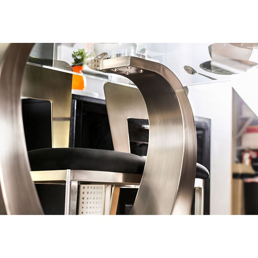ORLA Silver/Black Side Chair (2/CTN), 17"W X 21"D X 37"H, 42lbs. These round cut-out metal back chairs are satin plated, powder-coated and feature ...