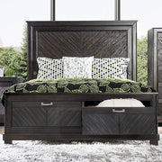 Argyros Espresso Cal.King Bed, 91 1/2"L X 80 3/4"W X 64"H, 261.98lbs. This bedroom set uses V-patterned wood panels to create an elegant display of color and texture.The result is an almost iridescent shine that can give this set a two toned appearance. A tall headboard design allows for more wood to show off its luscious quality and holds a hidden internal USB outlet. The foot board drawers and matching case good faces have the same V-pattern but use a flat strip along with vibrant nickel hardware to separate individual drawers. Simple block feet hold up this sophisticated collection filled with rich wooden hues. Features: Transitional Style Platform Bed Built-in USB Outlets V-Shape Plank Design Built-in USB Outlets Footboard Storage Drawers Foundation Required