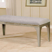DIOCLES Silver/Light Gray Bench, 50 1/2"W X 20 1/2"D X 21"H, 42.9lbs. A glamorous design that will amaze guests of all ages, this dining collection is a superb addition to any formal dining room. The lengthy bench with its tufted seat and soft coloring adds a beautiful and elegant touch to the already charming silver f inish. Features: Contemporary Style Flannelette Cushions Button Tufted Chair Backs Solid Wood, Wood Veneer, Others Silver Finish