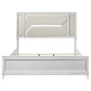Indulge in the luxurious elegance of this modern Italian-designed bed, perfect for creating the opulent bedroom you deserve. The striking, clean lines and picture framed recessed panels with embossed herringbone graphic patterns exude sophistication. Accented with mirror framing and acrylic legs, the bed also features polished chrome metal hardware and touch LED lights in the 3-dimensional headboard, upholstered in off-white boucle fabric. Crafted from Asian hardwood, MDF, foam, and mirror, this bed offers both style and durability. Available in queen, eastern king, and California king sizes to suit your preferences.