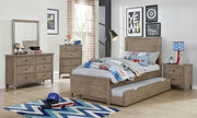 For the young person with burgeoning style, here is a refined set befit of maturing taste. A rich wood grain texture unifies the ensemble. A paneled headboard and footboard flank the bed frame that conceals a wheeled pull-out trumble to serve the instant accommodation of a guest. Remove the mattress to create easily accessible storage space. No-frills molding and spacious drawers speak to a greater efficiency. Collectively the matching pieces establish a theme that can be embellished by additional decor, allowing for easy room transformation. In a cosmetic sense, this motif is quite versatile.