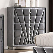 CARISSA Chest, 41"W X 18 1/8"D X 48 1/2"H, 170.9lbs. The ultimate Art Deco-inspired chest! The elegance, glamour, unique shapes and vintage appeal of 1930's Hollywood is right here! The decadent black velvet upholstery looks like it came right out of a classic old movie! There's a prestige with the unique design that seems to capture all of the excitement of a beloved bygone era! Additional embellishments such as rhombus chrome feet and diamond ring drawer-pulls faithfully enhance the cinematic reality.