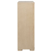 This five-drawer chest offers a balance of style and storage with its light elm finish and brushed nickel fingertip pulls. Rounded corners enhance its sleek design, while extra-large tinted drawers provide ample storage. Built with French dovetail fronts, English dovetail backs, and smooth metal glides, this chest is as durable as it is elegant, making it ideal for compact and modern bedrooms.