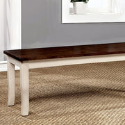 This bench is finished in two-tone: rich cherry seat and black legs. It features an elegant design showcasing contoured wood seats and slatted backs.