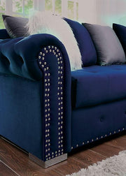 WILMINGTON Sectional, Blue, 108 3/4"L X 73"W X 30 1/4"H, 212.3lbs. Luxury and comfort are the cornerstones of this sectional. There's a spectacular feel to the soft velvet-like fabric that wraps the whole piece, accentuated by button tufting all around. Although clearly inspired by the traditional chesterfield sofa, details like nailhead trim, chrome bracket feet, and attached chaise set it apart.