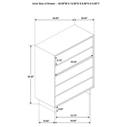 A compact footprint ensures that this modern four-drawer chest blends into any bedroom ensemble. Delivering handsome storage for clothing and accessories, the chest is complete with a felt lined top drawer that offers protection for delicates. Its four drawers include fingertip pulls, ensuring a smooth front. Mitered trim adds dimension and depth while a warm brown wood finish blends with any decor motif. Wide legs elevate the chest, creating an airy look and feel for your contemporary bedroom.