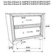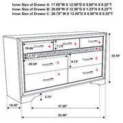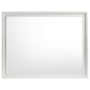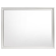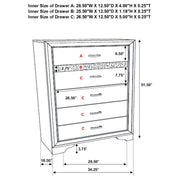 Sparkling diamond-like trim ups the glamour for a five-piece modern bedroom set. Compelling in its elegant simplicity, it centers on an upholstered bed and features a lightly textured white finish paired with smooth white molded trim. A nightstand, dresser with mirror, and chest provide plenty of drawers for easy storage and organization. Stripes of glittering, diamond-like trim and jewel-like bar pulls elevate the set, creating a fresh, sophisticated look and feel for your bedroom. Bracket feet complete the look with a touch of movement.