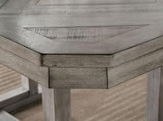 LAQUILA Dining Table, Gray, 60"L X 36"W X 30"H, 90.2lbs. This distinctly shaped table will help you build an outstanding dining space. The gray table top features a hint of warm tone, displaying a diamond wood grain pattern that plays off the cut-out corners. Playing off the same hue is the soft gray linen-like fabric, offering comfortable seating on the matching chairs and bench. The ladder back design shows protrusions on the sides of the chair; it's an element found on both ends of the trestle base as well, a sort of rugged style cleverly complemented by the wire-brushed frames.