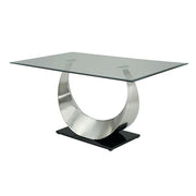 ORLA Silver/Black Dining Table, 60"L X 36"W X 30"H, 136lbs. Graceful and dignified, this one-of-a-kind table will make any meal feel like a fanciful feast. Featuring a unique chrome base, this stunning fixture sits atop a contrasting black flat base as it holds up a beveled edge glass table top. Complete this piece with the coordinating round cut-out metal back chairs, which feature black foam filled seat cushions. Features: Contemporary Style 10mm Tempered Glass Table Top U-Shaped Post & Black Base Sturdy Metal Construction Powder Coated Satin Plated