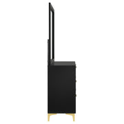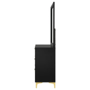 Brighten up your bedroom with the modern glam and cheer of this six-drawer dresser, a statement piece that brings a light and airy feel to contemporary spaces. Gold-finished pulls and bracket-style legs infuse the piece with a touch of luxury, while the crisp white finish keeps it sleek and dignified. Ideal for anchoring your focal wall or complementing a vanity area, this long and narrow dresser is a splendid addition. The accompanying contemporary mirror, framed in white, adds height and elegance, creating a formal vanity when placed atop the dresser.