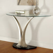 VALO Satin Plated/Black Sofa Table, 46"L X 16"W X 29 5/8"H, 35.9lbs. These contemporary living room tables feature oval tempered glass tabletops and distinct pedestals, sure to add a modern air to any living space. Features: Contemporary Style 8mm Black Beveled Tempered Glass Top V-Pedestal Metal, Others Satin Plated Finish