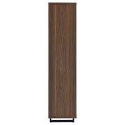 Create storage and add charm in one with a modern bookcase. It features a cabinet in the base, decorated with slatted doors that open to reveal shelving for easy storage. Upper shelves are open, with a center slat that creates dimension and offers structured support. The bookcase features a warm, rich walnut wood finish, easily lending in modern and mid-century inspired living spaces, bedrooms, and dens. The bookcase features a melamine finish that's durable and resistant to scratches and a tip-over restraint is included for added safety.