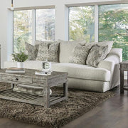 Bright grays and whites work in harmony to produce this stunning set. Welt trim outlining the collection arms and cushions and a unique textured fabric give each piece a timeless feel. Cushions are reversible offering impeccable comfort with spring seats and webbed back suspensions. Included pillows with ashy graphics are filled with luxurious down fiber bland. The off-white color adds to this allure - a neutral that works so well with most home motifs.