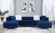 CIABATTONI Sectional, Navy, 126 1/2"L X 71 1/2"W X 29 3/4"H (SEAT HT: 20 3/4", SEAT DP: 25"- 62 3/4"), 330.11lbs. Decorator-inspired flannelette fabric, high arms of regal stature and deep tufted frames combine for a seating experience that is forever inviting. The classic tuxedo design flourishes among more modern details such as the steel legs and chaise on both left and right side of the sectional. Disparate pieces that all come together in a beautiful and versatile package--the matching oversized ottoman fits perfectly in between the chaises and turns this into a spacious bed to frolic upon.