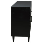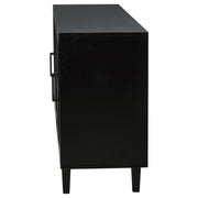 This versatile sideboard combines modern elegance with functional design. It features tempered glass-paneled cabinet doors that reveal adjustable shelving, perfect for displaying or organizing items. Two smooth-gliding, felt-lined drawers offer concealed storage for delicate essentials. Crafted from durable mahogany, engineered wood, and ash veneer, this piece is supported by sturdy tapered legs, ensuring lasting stability and style. Ideal for dining, living room, or multipurpose storage needs.
