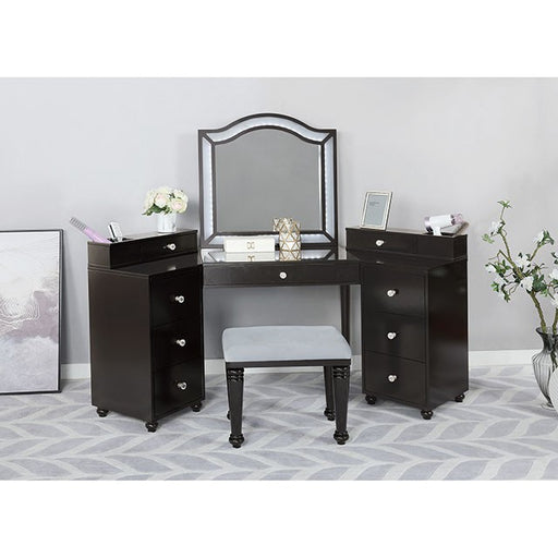Elevate your beauty routine with the Evangeline vanity set, a trio of elegance featuring a desk with ample storage and built-in charging ports, a t...