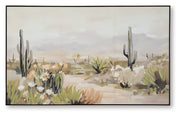 Bring the beauty of the desert into your home. This captivatingly calm wall art showcases a serene landscape, complete with iconic cacti and delicate blooms. Crafted with meticulous detail, the hand embellished canvas is a perfect choice for those seeking a touch of southwestern charm.