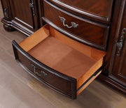 The most festive occasions deserve the most stylish furniture! Finished in brown cherry, the set's rich details include decorative faux wood carvings on the legs reminiscent of baroque styling. The dramatic buffet and hutch has tempered glass doors and multiple shelves and drawers to store china and silverware.