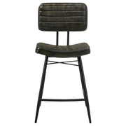 Spice up your casual space with the ranch-style influence of this seven-piece counter height dining set. Indulge in a calm vibe with a set anchored by a natural finish sheesham table featuring a spacious rectangular top and tapered, rounded legs. A dark apron with geometric design detail adds an exotic effect. Mid-Century Modern influence adds to comfortable counter stools with scoop seats and a thick back, both with horizontally channeled leather upholstery, as metal framing features iconic slender rounded, splayed legs. Set includes one rectangular counter height table and six counter stools.